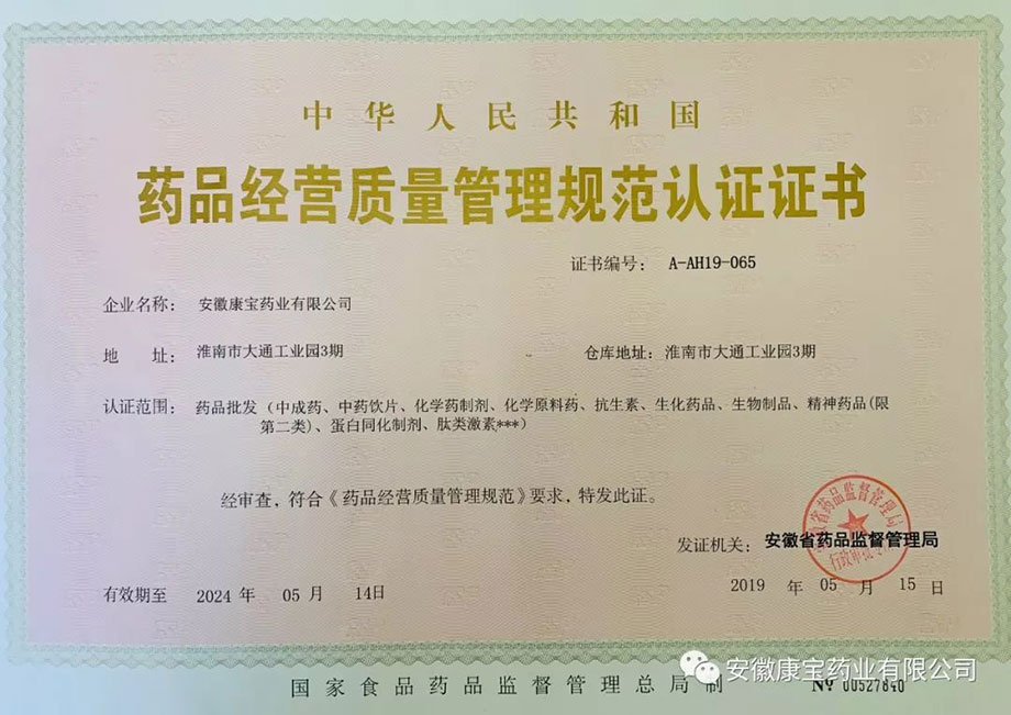 2019年5月23日,安徽省藥品監督管理局正式將重新認證后的《藥品經營質量管理規范認證證書》、《藥品經營許可證》頒發給康寶藥業,標志著我公司順利通過此次GSP認證檢查。